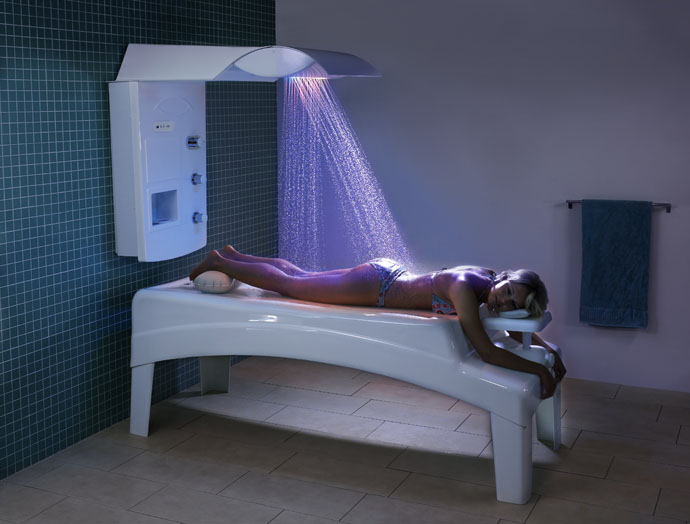 Выбор режима и настройка температуры осуществляются через влагостойкий плёночный экран. Предусмотрена возможность изменения высоты кушетки, диапазон регулировки – 725-875 мм. Кушетка дополнительно оснащена душевым гарнитуром с утапливаемой рейкой. По желанию душ может быть оснащён системой подогрева ложа, цветной душевой рейкой для хромотерапии, системой автоматического интервального душа для верхней и нижней зон тела.