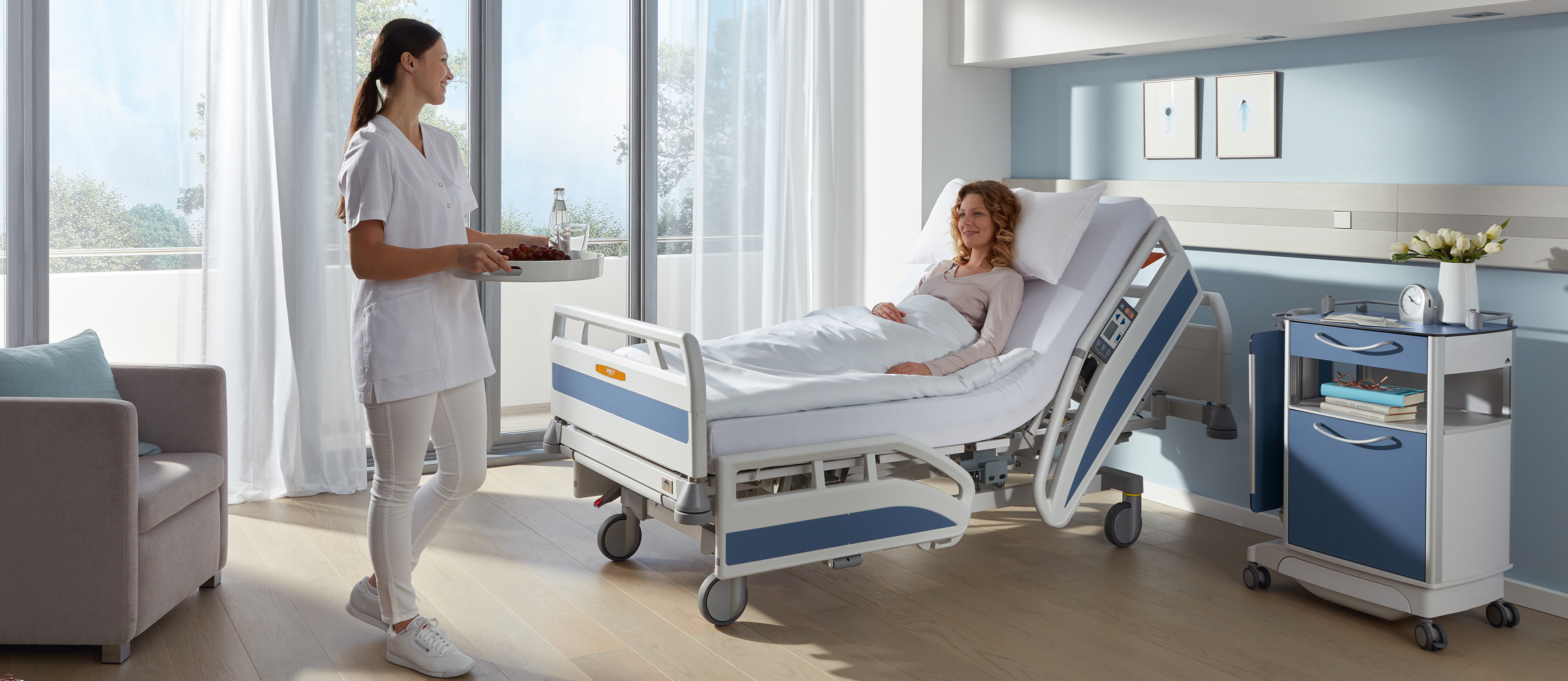 Спинная секция изготовлена из рентгенопрозрачного материала HPL повышенной прочности. В перечень доступных функций входят: автоматическая регрессия для платформы кровати, положение кардиологического кресла, взвешивание пациента с точностью +-0,5 кг, звуковое оповещение при покидании пациентом кровати. Управление осуществляется через панель с сенсорным экраном или через пульт. Поставляется в комплекте с аккумулятором резервного питания. Также в конструкции предусмотрены инфузионная стойка, дуга для подтягивания, полка для гигиенического судна.