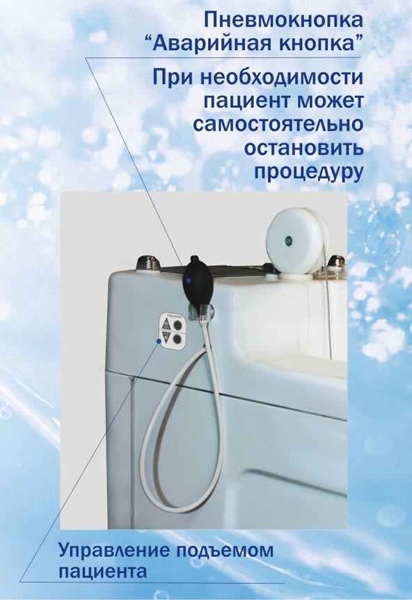 Автоматизированный комплекс горизонтального подводного вытяжения со встроенным механизмом подъема пациентаВажным пунктом следует считать безопасность пациента во время проведения процедуры подводного вытяжения позвоночника. Встроенная электромеханическая и электронная защиты защищают от перегрузок во время шейного и поясничного вытяжения. Кнопка экстренной остановки процедуры «аварийная кнопка» вручается пациенту. При возникновении неприятных ощущений пациент может самостоятельно остановить процедуру.