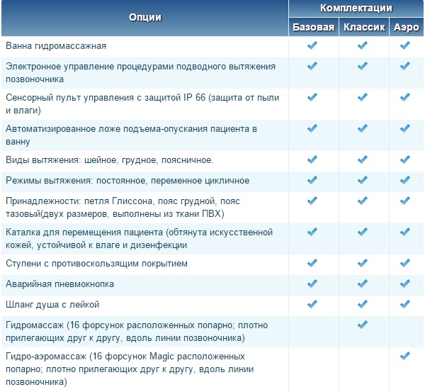 Все комплектации комплекса включают в себя электронную систему вытяжения, встроенный автоматизированный подъемник, каталку для пациента, ступени для ванны, ремни для пояснично-крестцового вытяжения в 2-х размерах и петлю Глиссона для шейного вытяжения - все для того, чтобы Вы получили полностью готовое к работе оборудование, не затрачивая лишних средств на закупку дополнительных опций.