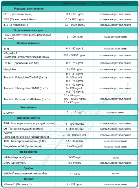 Анализатор предназначен для получения результатов количественного или качественного анализа путем исследования человеческих образцов с помощью специальных тест-кассет (реагентов) для определения специфических аналитов. Полученные результаты исследований используются в клинической диагностике для определения маркеров воспаления, коагуляции, опухолевых маркеров, диабета, сердечных маркеров, инфекционных и аутоиммунных заболеваний.