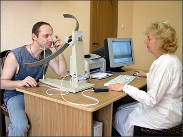Проведение диагностики полей зрения с применением аппарата "ПЕРИСКАН" совместно с компьютером.