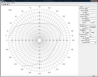 > формирует наглядный результат диагностики на диаграмной сетке в виде непрерывной линии, огибающей область зрения с выделением областей скотом, если таковые были определены;