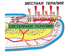 При традиционной местной терапии противогрибковый препарат наносится непосредственно на область поражения (пораженный ноготь). Отсутствие побочных и токсических эффектов, является главным преимуществом местной терапии. Второе преимущество местной терапии обеспечивается широким спектром применения практически любого местного антимикотика, по причине того, что его концентрация в очаге поражения существенно превосходит концентрацию системных средств. Недостатком местной терапии является то, что при нанесении лекарственного препарата непосредственно на пораженный ноготь препарат не всегда достигает возбудителя, расположенного в ногтевом ложе, и, тем более, в матриксе. Поэтому для депонирования антимикотика к зараженному участку приходится прибегать к вспомогательным средствам – кератолитикам, механическому удалению ногтевой пластинки, чистке ногтевого ложа, что делает местную терапию достаточно трудоемкой, особенно при поражении сразу нескольких ногтей.