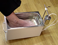 Расположение ноги в ультразвуковой ванне аппарата "АЛОМ" при использовании стационарного излучателя ультразвука.