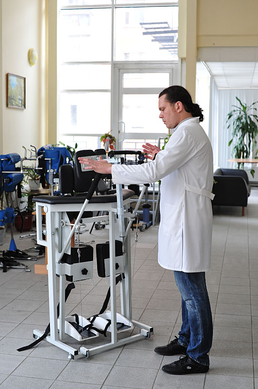 Для пациентов с повреждением шейного и верхнегрудного отдела спинного мозга предусмотрена дополнительная опора на уровне груди и с помощью инструктора или вертикализатора такие пациенты тоже могут занять вертикальное положение и выполнять реабилитационные упражнения.