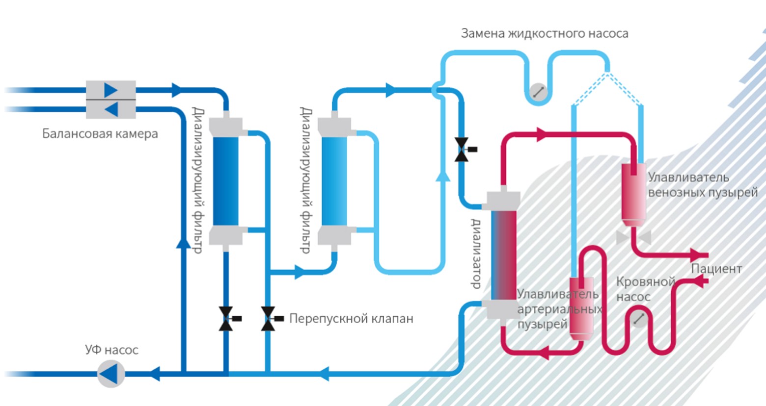 система баланса, система смешивания жидкостей, ультрафильтрации, система контура крови