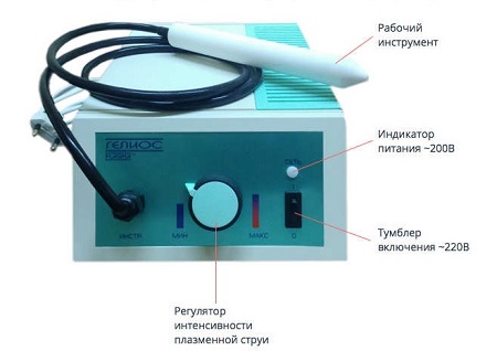Гелиос - это медицинский прибор, предназначенный для обработки живых тканей потоком холодной плазмы. Аппарат воздействует на ткани неравновесной холодной плазмой, получаемой в среде инертного газа (гелия марки "В"). Ионы и нейтральные частицы в плазме имеют очень малую энергию, поэтому температура такой плазмы небольшая, всего 30-45°С.