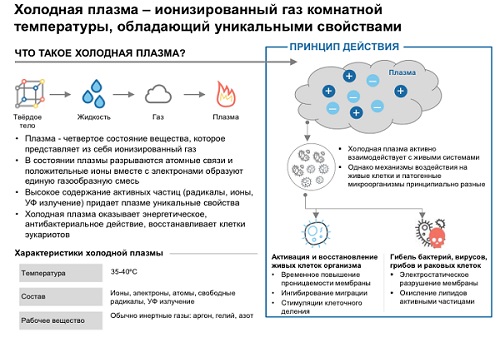 Холодная плазма – это достаточно новое направление в медицине и сегодня в мире существует всего несколько компаний, которые используют эту технологию в медицинском оборудовании. Низкотемпературная плазма представляет из себя ионизированный газ комнатной температуры. При взаимодействии с биологическими объектами с одной стороны, плазма за несколько секунд уничтожает патогенные микроорганизмы (бактерии, вирусы, грибы), а с другой запускает механизмы регенерации и деления человеческих клеток.