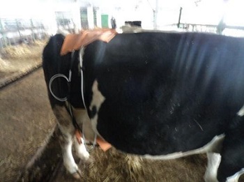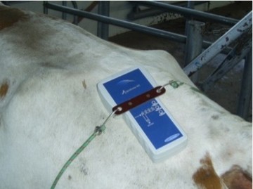 Прибор Акватон подвешивается на вымя коровы для удобства с помощью резинки.