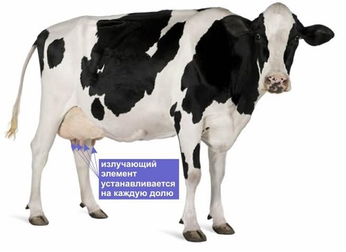 При лечении коров, больных маститом четыре излучающих элемента одновременно устанавливаются на все доли вымени, обеспечивая лечение и профилактику различных форм мастита. Пятый излучающий элемент может быть использован для лечения заболеваний суставов, яичников, различных форм эндометритов и.т.д.