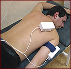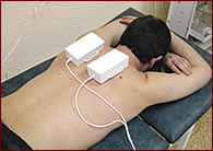 Паравертебральное расположение парного призматического излучателя бегущего магнитного поля при лечении остеохондроза шейного отдела позвоночника.
