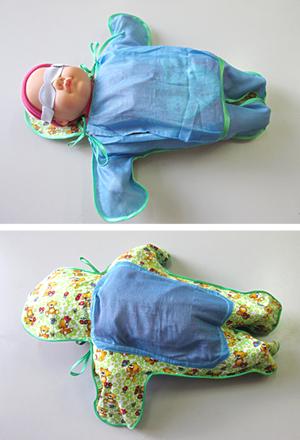Фланелевый конверт с полупрозрачными для синего света окнами со стороны спины и груди ребенка.