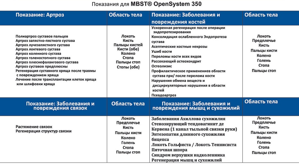 Спектр показаний к MBST-терапии разнообразен. Вот некоторые из них: