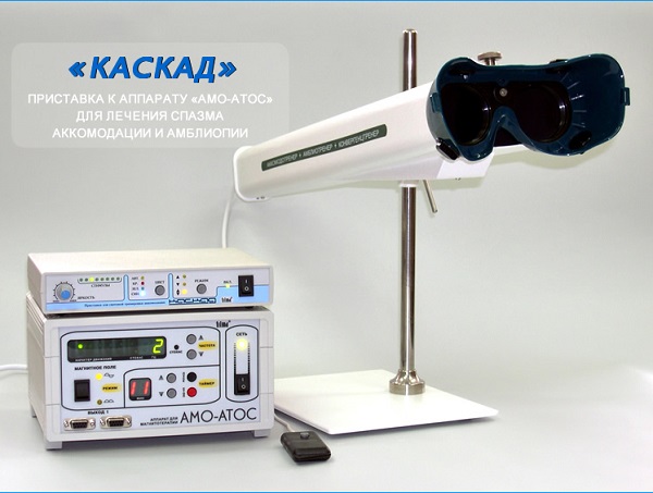 Примером такого комбинированного метода лечения является совместное использование устройства-приставки "КАСКАД" и аппарата для магнитотерапии "АМО-АТОС": лечение с помощью устройства-приставки "КАСКАД" + транскраниальное воздействие с помощью устройства-приставки "ОГОЛОВЬЕ" к аппарату "АМО-АТОС" (поставляется по отдельному заказу) в случаях выявления вегетативных нарушений у больного или атрофии зрительного нерва.