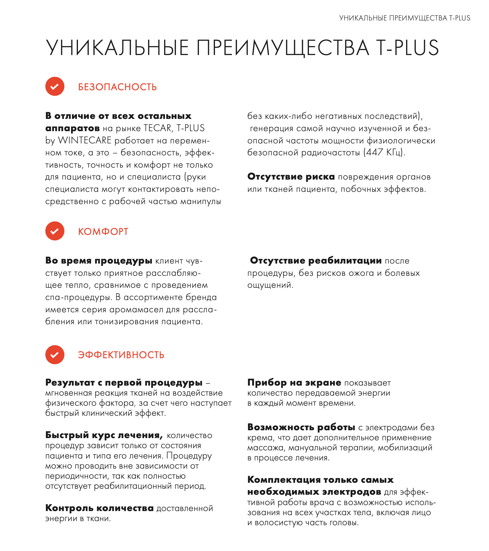 АППАРАТ T-PLUS BY WINTECARE работает на запатентованной постоянной генерируемой частоте, 447+/- 2 КГц, что обеспечивает максимально возможную глубину воздействия на ткани и соответствует регламенту технологии TECAR