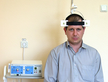 Расположение излучателя "ОГОЛОВЬЕ" при проведении процедуры транскраниального воздействия в положении пациента сидя.