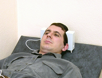 Расположение излучателя "ОГОЛОВЬЕ" при проведении процедуры транскраниального воздействия в положении пациента лёжа.