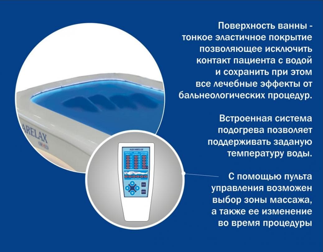 Ванна "Акварелакс" входит в состав комплекса реабилитации после COVID-19 позволяет проводить гидромассаж тела без его погружения в водную среду. При этом сохраняются все лечебные эффекты гидромассажа, но резко снижается число противопоказаний и риск инфекционных заболеваний.