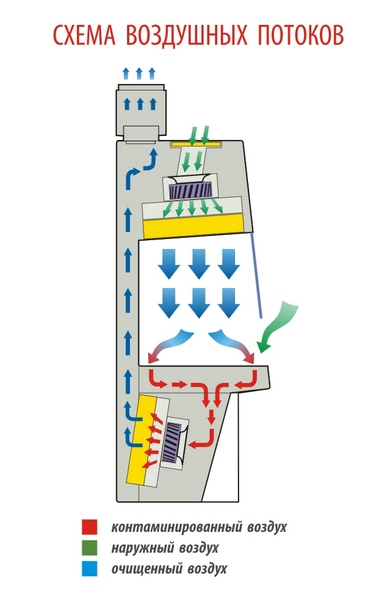 - Контаминированный воздух проходит высокоэффективную очистку и полностью удаляется во внешнюю вытяжную систему;