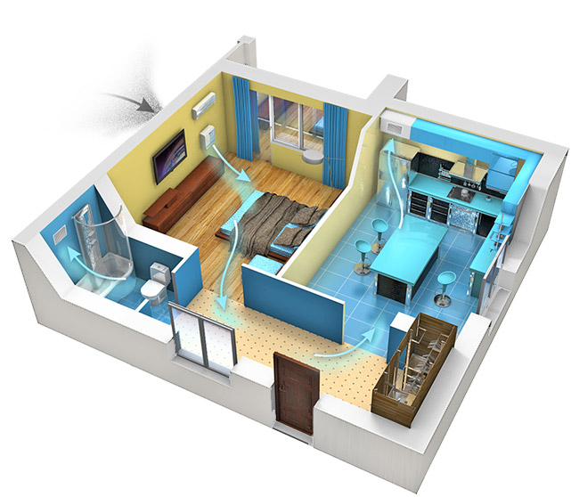 Бризер Tion O2 нужен там, где люди проводят максимум времени, т.е где больше всего «дышат»: детская, кухня, спальня, гостиная. Общие принципы: 1 прибор на 1 комнату до 40 м2 (до 4-х человек). Рекомендуется установка под подоконником, рядом с батареей или сбоку от окна — там, где достаточно места для бризера (511×451×163 мм). Пульт позволяет вешать прибор под потолок.