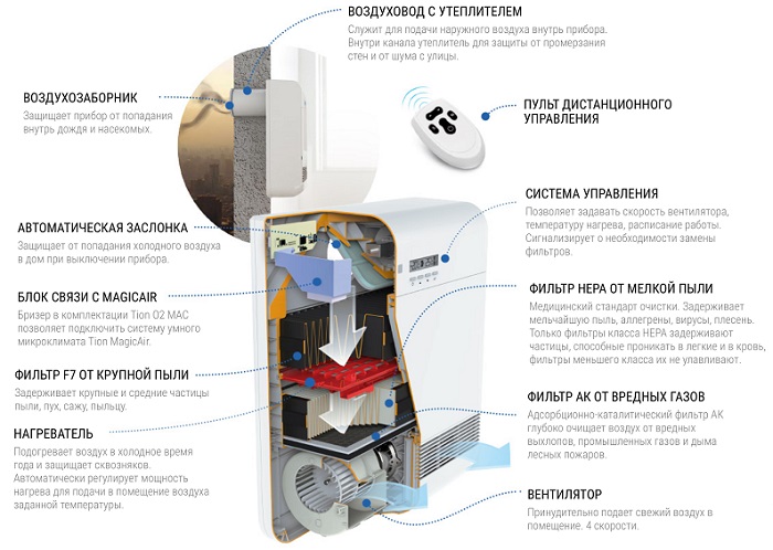 Бризер Тion O2 соединяется с воздухозаборным каналом, фиксируется на стене и подключается к обычной электророзетке с напряжением 220В.