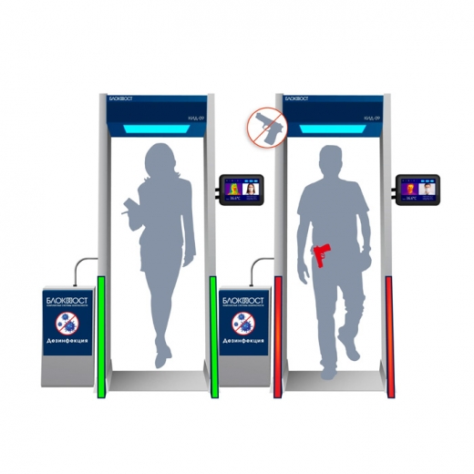 Универсальный досмотрово-дезинфекционный пост объединяет в себе тепловизионную систему измерения температуры, металлодетектор и автоматизированную рамку санобработки всей поверхности тела, за счет чего достигается установка в условиях ограниченного пространства.