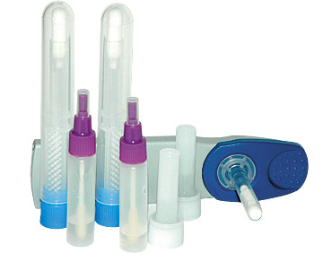 Одноразовая герметически запакованная тест-кассета с интегрированным устройством отбора пробы и флакончик с буферной жидкостью являются необходимым материалом для проведения процедуры тестирования. Тест-кассета имеет индикатор, который окрашивается в синий цвет при отборе достаточного для анализа объема пробы.
