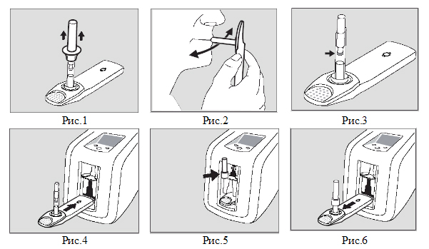 Из герметичной упаковки извлекается тест-кассета, удаляется защитный колпачок с пробоотборного устройства (рис. 1);