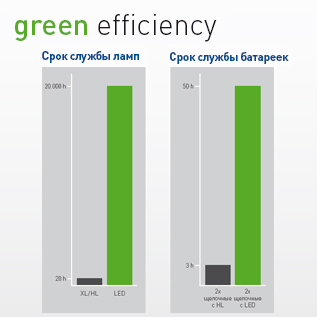 Экономичность за счет более продолжительного срока службы светодиодов и батареек. в то время как срок службы ксенонового источника составляет всего 20 часов, светодиодное освещение может работать как минимум 20000 часов, т.е. на протяжении более чем 2 лет, и при этом в отоскопе e-scope® на двух обычных батарейках 2,5 V AA.