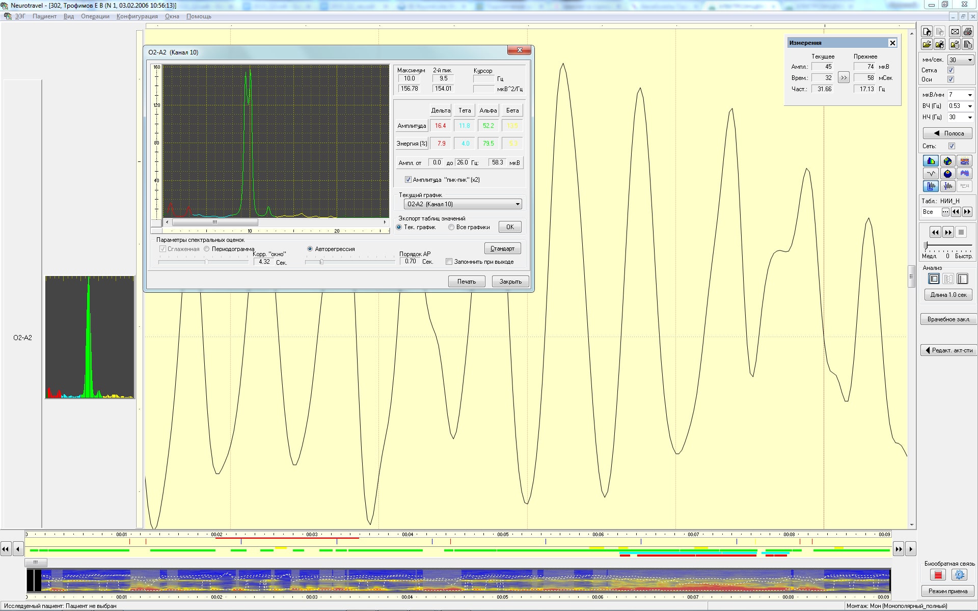 Анализ ЭЭГ в реальном времени: спектральный анализ, когерентность, картирование, спектральный тренд (DSA), амплитудный и амплитудно-интегрированный (CFM) тренды работают и во время записи ЭЭГ.