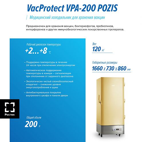 Вертикальный медицинский холодильник VacProtect VPA-200 (200 л) предназначен для хранения вакцин, анатоксинов, иммуноглобулинов, бактериофагов, пробиотиков, интерферонов, цитокинов и других иммунобиологических лекарственных препаратов согласно требованиям СанПин 3.3.2.3332-16 при температуре от +2°С до +8°С.