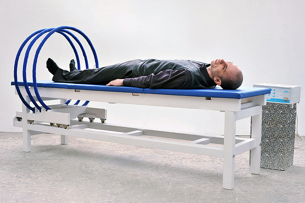 Специальная кушетка позволяет пациенту удобно лежать во время процедуры, а персоналу помогает быстро изменять конфигурацию трех соленоидов для создания либо вращающегося импульсного («призмы»), либо бегущего импульсного магнитного поля («цилиндра»), охватывающего все тело.