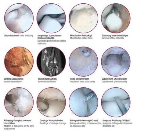 Терапевтические возможности артроскопии локтевого сустава покрывают целый спектр таких манипуляций как, артролиз в случае первичных и вторичных артрозов и лечения посттравматических артрофиброзов. Между тем, по сравнению с открытым артролизом, были получены лучшие функциональные результаты и меньшая заболеваемость при скрининге. В руках тренированного и образованного хирурга, использующего данную стандартизированную технику и учитывающего значимые анатомические образования, уровень осложнений ниже, даже несмотря на близко расположенные нервно-сосудистые пучки. Комплексный артролиз включает в себя удаление флотирующих артрозных образований в суставе, абляцию остеофитов, внутрисуставной дебридмент мягких тканей с синовэктомией, размягчение хряща, релиз трицепса и полную вентральную капсулэктомию. Если у пациента достоверно имеется ревматическое поражение, то артроскопическая синовэктомия является необходимой процедурой в соответствии с программой лечения, и, совместно с медикаментозной терапией, направлена на уменьшение агрессивных механизмов дегенерации.