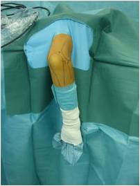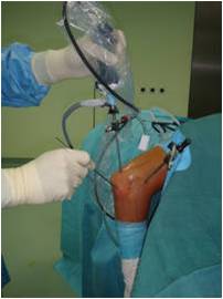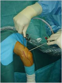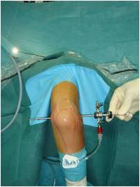 Мы рекомендуем начинать артроскопию локтевого сустава из дорсальной позиции. Сначала сустав заполняется примерно 20 мл ирригационной жидкости через дорсорадиальный компартмент. Антерорадиальный троакар затем вводится в вентральный компартмент. После этого к данному троакару подключается постоянный ток жидкости. Проксимальный дорсорадиальный порт производится на уровне верхушки олекранона,- для этого необходимо ввести проводник Виссингера.