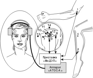 Еще большего усиления эффекта в лечении атрофии зрительного нерва можно добиться при применении совместно с излучателем "ОГОЛОВЬЕ" аппарата "МнДЭП" для многоканальной электростимуляции биологически активных точек (БАТ), ответственных за зрение.