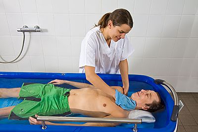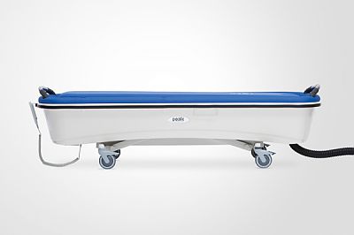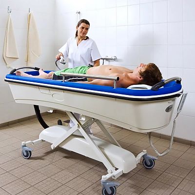 Уникальная конструкция ванны позволяет полностью опускать ее борта вровень с ложем каталки для удобного и безопасного перемещения пациента.