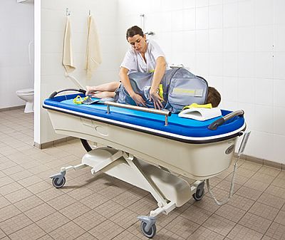 Каталка PACIFIC позволяет пациентам с ограниченной подвижностью принимать душ и ванну в условиях медицинского стационара.