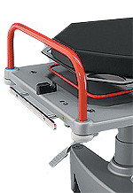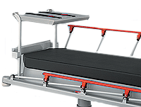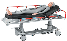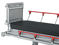 - • Боковой ограничитель легок и надежен в обращении. Нет опасности травм пальцев санитаров.Может опускаться ниже уровня матраса лежака.