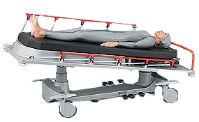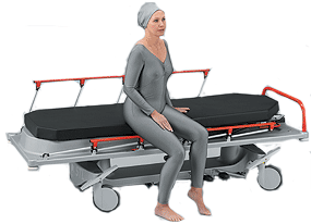 - • Функции регулировки поверхности лежака по высоте и по Тренделенбургу/против Тренделенбурга доступны с каждой из двух длинных сторон каталки. Центральная система фиксации колесиков и направления доступна со всех сторон.
