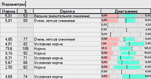 формируется таблица, в которой приводятся расчетные параметры, должные величины, их сравнение в процентном выражении и качественные (словесные) оценки параметров;