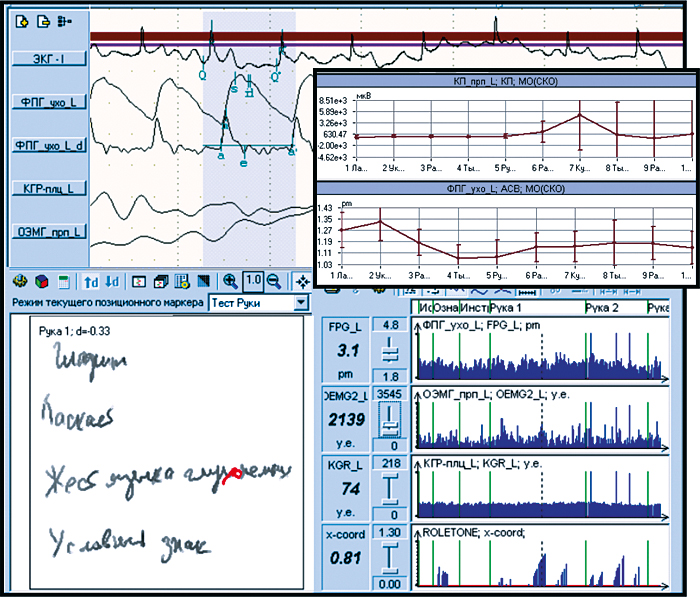 Обеспечивается синхронное автодокументирование процессов психологического и психофизиологического тестирования испытуемого на сенсорном планшете или мониторе-планшете, а также параметров моторной деятельности испытуемого, отражающих его эмоциональные реакции.