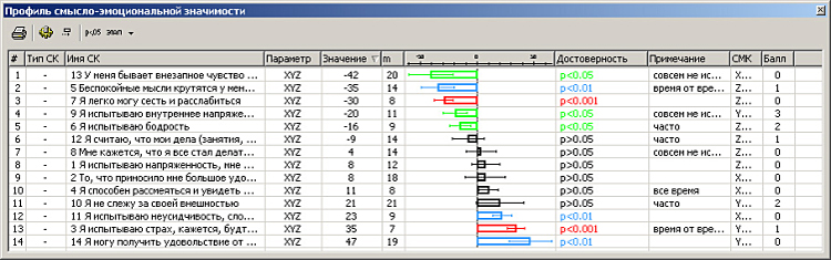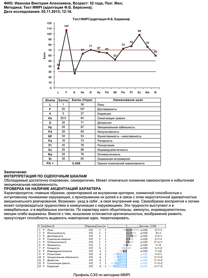 Получаемая дополнительная психодиагностическая информация гармонично встраивается в известные психологические и психофизиологические тесты и позволяет получить профили смысло-эмоциональной значимости (СЭЗ), которые объективно отражают произвольные и непроизвольные реакции обследуемого в привязке к этапам, типовым шкалам и смысловым кластерам стандартных тестов и предоставляют психологу уникальную возможность для верификации результатов проведенного исследования.
