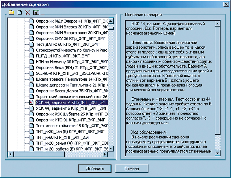 В поставляемую библиотеку тестов входит широкий перечень тестов – тесты состояния, личностные тесты, проективные тесты, когнитивные тесты, психофизиологический тесты (перечень тестов предоставляется по запросу, возможно уточнение состава тестов по согласованию с Заказчиком). Расширенные возможности по обработке и анализу психофизиологических реакций испытуемого в процессе тестирования (обязательно необходима регистрация физиологических показателей по полиграфическим каналам).