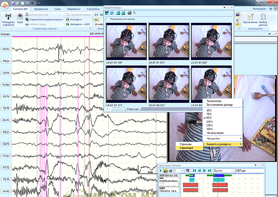 Возможен просмотр видеозаписи с нормальной, ускоренной, или замедленной скоростью, а также режим стоп-кадра и быстрый переход к любому моменту данных ЭЭГ-видеомониторинга (по указанному времени, маркерам или меткам).