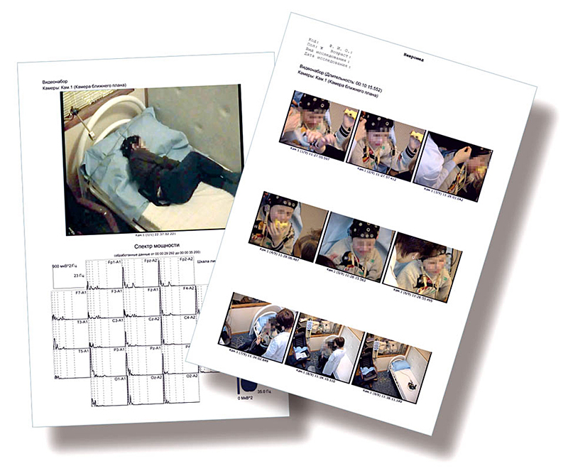Видеоролик может включать в себя диагностически значимые ЭЭГ-фрагменты, видеоинформацию от одной или двух видеокамер, аудиоинформацию от микрофонов врача и пациента, а также таймер времени.