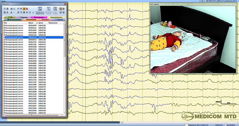 Автоматическое распознавание и маркирование фрагментов нестационарностей или эпилептиформной активности производятся при записи и при обработке ЭЭГ. Найденные фрагменты выделяются цветом, сохраняются и доступны для быстрого поиска.