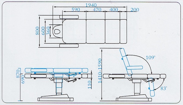 Имеются электрические регулировки высоты подъёма и угла наклона спинки и механическая регулировка положения подушки под ноги.