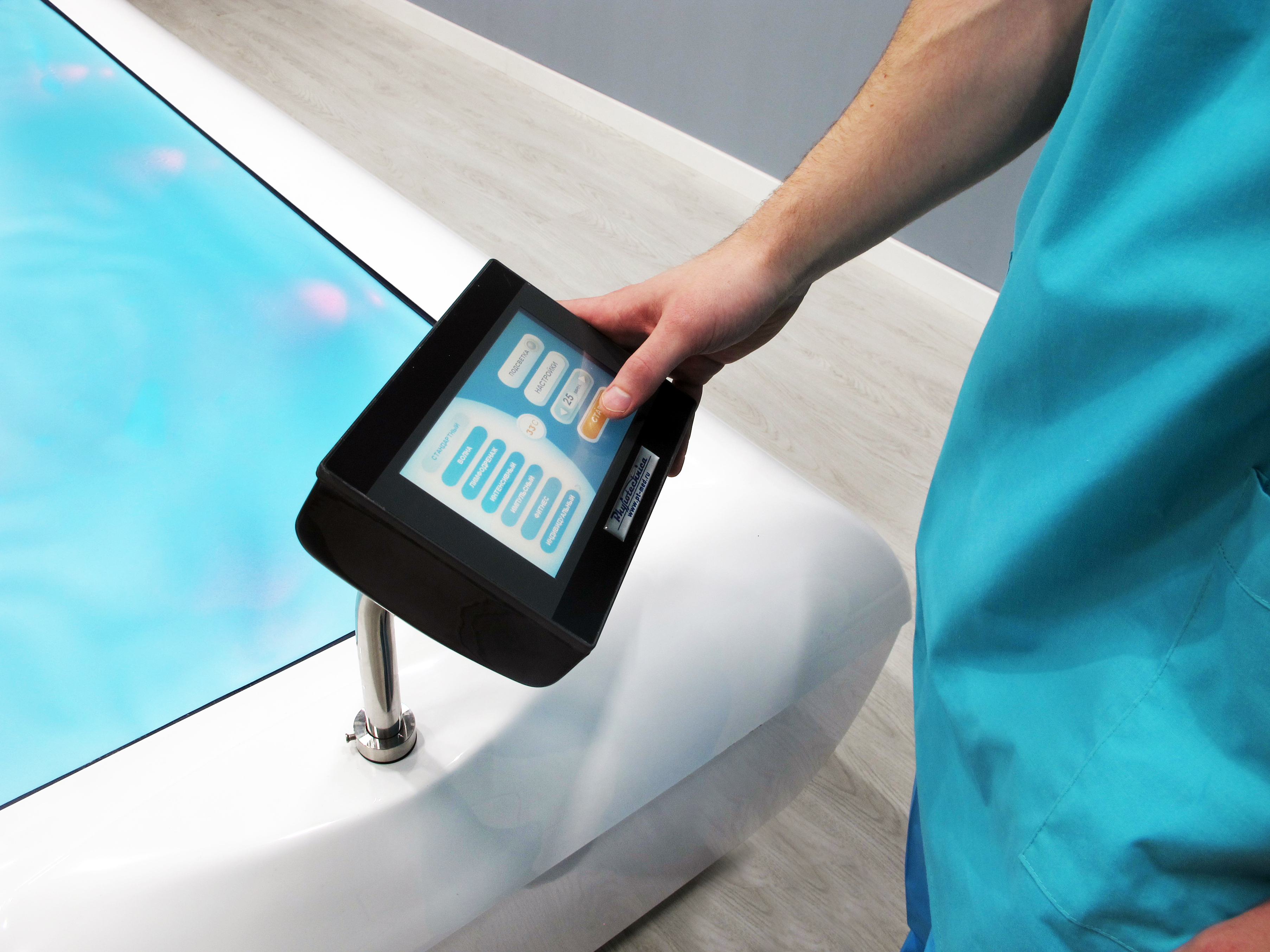 Кушетка «АКВАСПА» может быть оборудована 2 типами поворотных цветных сенсорных ЖК дисплеев, с помощью которых осуществляется программирование всех режимов и непосредственно управление ходом процедуры, как медицинским персоналом, так и самим пациентом. Программное обеспечение данного оборудования позволяет выбирать 1 из 6 имеющихся стандартных программ с различными видами массажных эффектов, а также программировать свою индивидуальную программу, корректируя выбор массажных зон и последовательность их активации по ходу проведения процедуры. Кроме того, у обслуживающего медицинского персонала есть возможность программирования включения и выключения работы оборудования исходя из режима рабочего дня и дней недели, а также иметь статистический отчет о времени проведенных процедур. Предусмотрена возможность корректировки рабочих программ через интернет, по заявке на завод изготовитель.