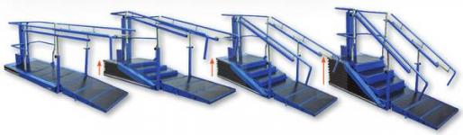 Тренажер в плоском положении (при нулевой высоте ступеней) используется как параллельные брусья, традиционно использующиеся в медицинской реабилитации. Брусья-поручни регулируются по высоте. Alter Step комплектуеся одинм или двумя рампами для пациентов в инвалидных колясках.